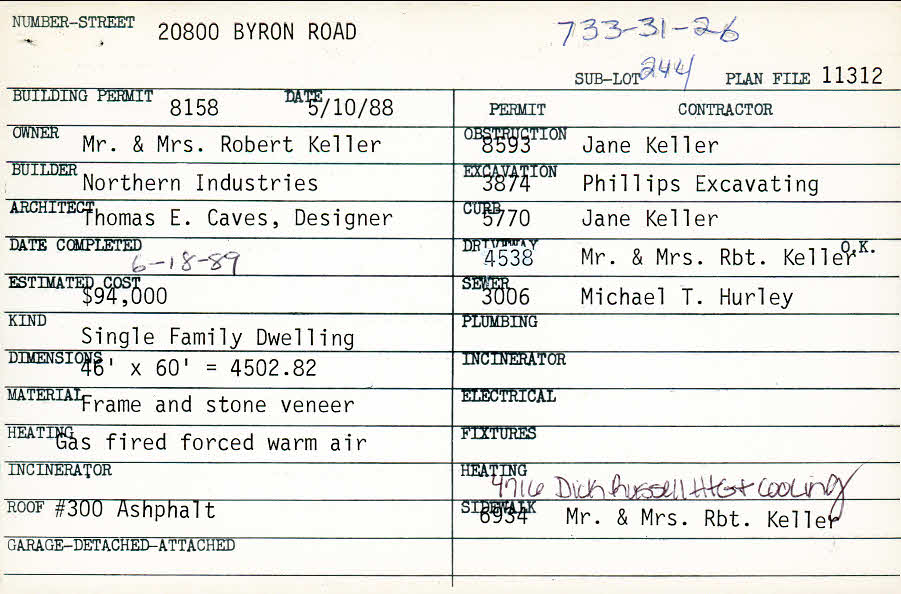 20800 Byron Road Shaker Heights, OH 44122 PARCEL ID: 733-31-026 Building Permit Date: 05-10-1988 Plan File Number: 11312* Microfilm Roll: NewRoll#7 Neighborhood: Mercer Owner: Keller, Mr. and Mrs. Robert Builder: Northern Industries Architect: Caves, Thomas E., Designer Estimated Cost: 94000 Date Completed: 06-18-1989 Kind: Single, Single Residence or Dwelling Material: Frame and Stone Veneer Heating: Forced Air - Gas Roof: 300# Min Asphalt |