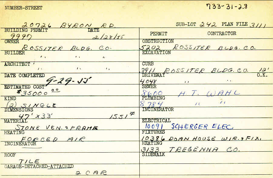 20726 Byron Road Shaker Heights, OH 44122 PARCEL ID: 733-31-028 Building Permit Date: 02-28-1955 Plan File Number: 3111, 6802 Microfilm Roll: Roll#43, Roll#88 Neighborhood: Mercer Owner: Rossiter Building Company Builder: Rossiter Building Company Architect: Rossiter Building Company Estimated Cost: 35000 Date Completed: 09-29-1955 Kind: Single, Single Residence or Dwelling (2) Material: Stone Veneer and Frame Heating: Forced Air Roof: Tile Garage: attached 2 car |