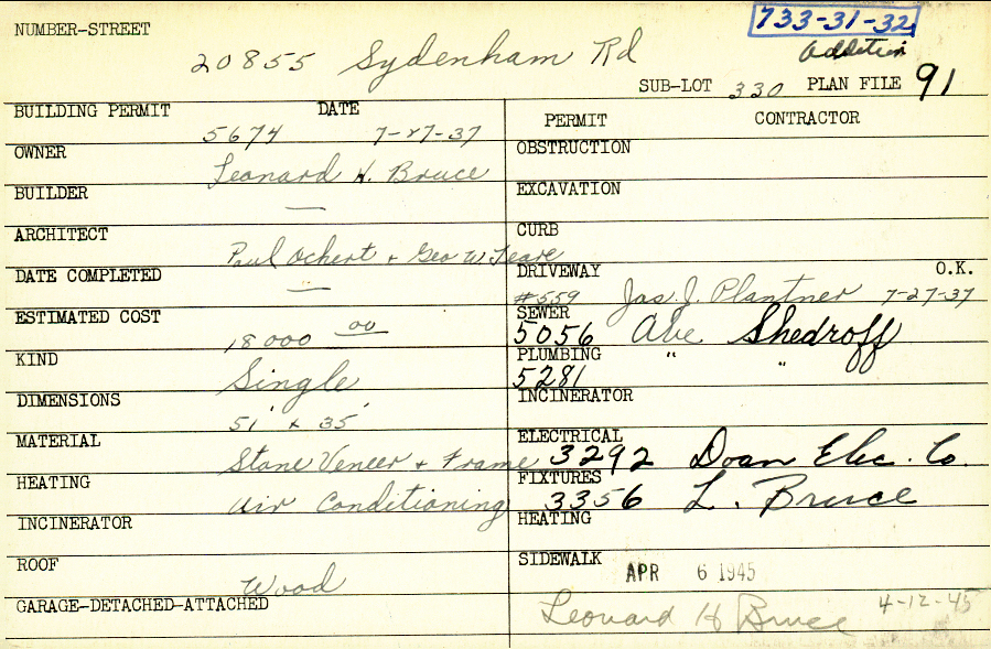 20855 Sydenham Road Shaker Heights, OH 44122 PARCEL ID: 733-31-032 Building Permit Date: 07-27-1937 Plan File Number: 91, 11492 Microfilm Roll: NewRoll#7 Neighborhood: Mercer Owner: Bruce, Leonard H. Architect: Ockert, Paul and Teare, George W. Estimated Cost: 18000 Kind: Single, Single Residence or Dwelling Material: Stone Veneer and Frame Heating: Air Conditioned Roof: Wood |