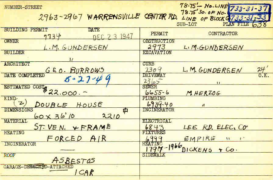 2967 Warrensville Center Road Shaker Heights, OH 44122 PARCEL ID: 733-31-033 Building Permit Date: 12-23-1947 Plan File Number: 638 Neighborhood: Malvern Owner: Gundersen, L. M. Builder: Gundersen, L. M. Architect: Burrows, George Estimated Cost: 22000 Date Completed: 05-27-1949 Kind: Duplex or Two-Family Material: Stone Veneer and Frame Heating: Forced Air Roof: Asbestos Garage: attached Card Available: yes |