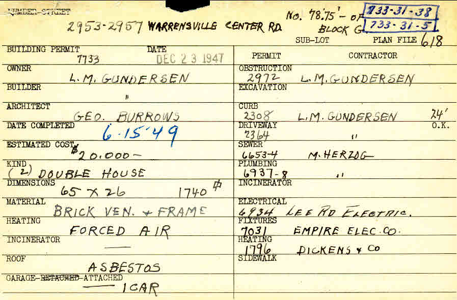 2953 Warrensville Center Road Shaker Heights, OH 44122 PARCEL ID: 733-31-038 Building Permit Date: 12-23-1947 Plan File Number: 618, 1354 all scanned Microfilm Roll: Roll008, Roll016 Neighborhood: Malvern Owner: Gundersen, L. M. Builder: Gundersen, L. M. Architect: Burrows, George Estimated Cost: 20000 Date Completed: 06-15-1949 Kind: Duplex or Two-Family Material: Brick Veneer and Frame Heating: Forced Air Roof: Asbestos Garage: attached |