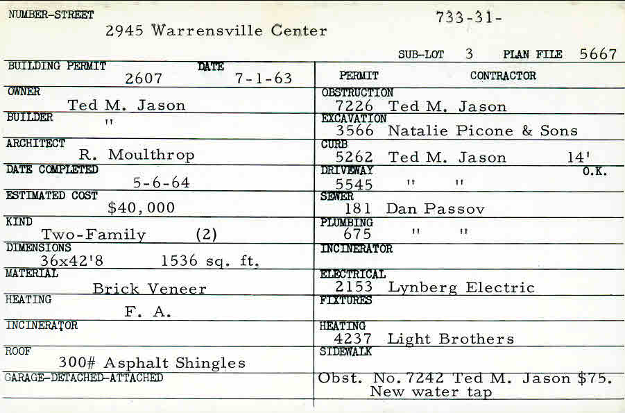 2945 Warrensville Center Road Shaker Heights, OH 44122 PARCEL ID: 733-31-041 Building Permit Date: 07-01-1963 Plan File Number: 5667 all scanned Microfilm Roll: Roll076 Neighborhood: Malvern Owner: Jason, Ted M. Builder: Jason, Ted M. Architect: Moulthrop, Ray Estimated Cost: 40000 Date Completed: 05-06-1964 Kind: Duplex or Two-Family Material: Brick Veneer Heating: Forced Air Roof: 300# Min Asphalt Blueprints: online, see link above |