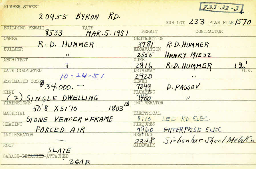 20955 Byron Road Shaker Heights, OH 44122 PARCEL ID: 733-32-003 Building Permit Date: 03-05-1951 Plan File Number: 1570 all scanned Microfilm Roll: Roll024 Neighborhood: Mercer Owner: Hummer, R. D. Builder: Hummer, R. D. Architect: Hummer, R. D. Estimated Cost: 34000 Date Completed: 10-24-1951 Kind: Single, Single Residence or Dwelling (2) Material: Stone Veneer and Frame Heating: Forced Air Roof: Slate Garage: attached 2 car |