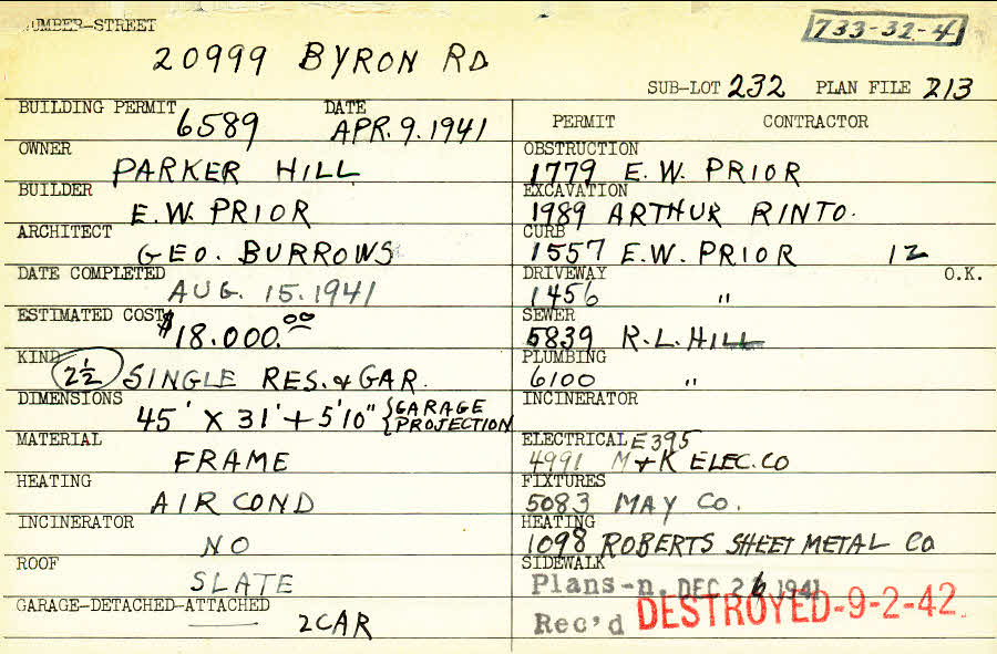 20999 Byron Road Shaker Heights, OH 44122 PARCEL ID: 733-32-004 Building Permit Date: 04-09-1941 Plan File Number: 213, 10680 Microfilm Roll: NewRoll#5 Neighborhood: Mercer Owner: Hill, Parker Builder: Prior, E. W. Architect: Burrows, George Estimated Cost: 18000 Date Completed: 08-15-1941 Kind: Single 2-1/2 Material: Frame Heating: Air Conditioned Roof: Slate Garage: attached 2 car |