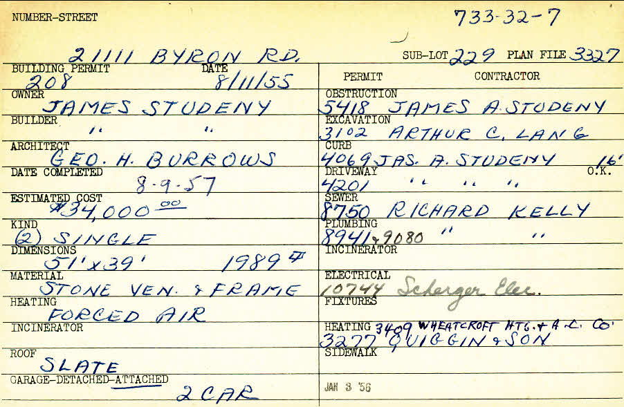 21111 Byron Road Shaker Heights, OH 44122 PARCEL ID: 733-32-007 Building Permit Date: 08-11-1955 Plan File Number: 3327, 12632 Microfilm Roll: Roll#48, NewRoll#14 Neighborhood: Mercer Owner: Studeny, James Builder: Studeny, James Architect: Burrows, George H. Estimated Cost: 34000 Date Completed: 08-09-1957 Kind: Single, Single Residence or Dwelling (2) Material: Stone Veneer and Frame Heating: Forced Air Roof: Slate Garage: attached 2 car |