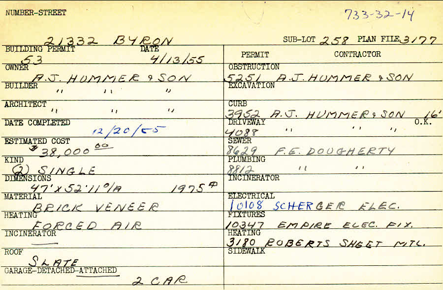 21332 Byron Road Shaker Heights, OH 44122 PARCEL ID: 733-32-014 Building Permit Date: 04-13-1955 Plan File Number: 3177, 3999 Microfilm Roll: Roll#44, Roll#58 Neighborhood: Mercer Owner: A. J. Hummer and Sons Builder: A. J. Hummer and Sons Architect: A. J. Hummer and Sons Estimated Cost: 38000 Date Completed: 12-20-1955 Kind: Single, Single Residence or Dwelling (2) Material: Brick Veneer Heating: Forced Air Roof: Slate Garage: attached 2 car |