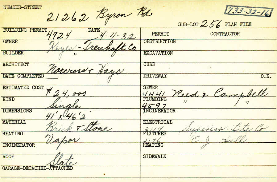 21262 Byron Road Shaker Heights, OH 44122 PARCEL ID: 733-32-016 Building Permit Date: 04-04-1932 Plan File Number: 0 Neighborhood: Mercer Owner: Keyes-Treuhaft Company Builder: Keyes-Treuhaft Company Architect: Norcross and Hays Estimated Cost: 24000 Kind: Single, Single Residence or Dwelling Material: Brick and Stone Heating: Vapor Roof: Slate |