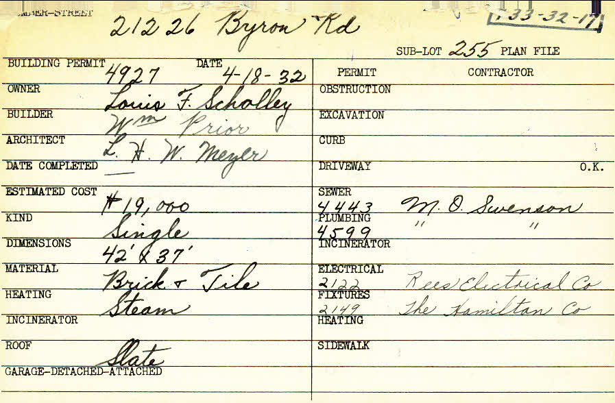 21226 Byron Road Shaker Heights, OH 44122 PARCEL ID: 733-32-017 Building Permit Date: 04-18-1932 Plan File Number: 1054, 7519 all scanned Microfilm Roll: Roll013, Roll093 Neighborhood: Mercer Owner: Scholley, Louis F. Builder: Prior, William Architect: Meyer, L. H. W. Estimated Cost: 19000 Kind: Single, Single Residence or Dwelling Material: Brick and Tile Heating: Steam Roof: Slate Blueprints: online, see link above |