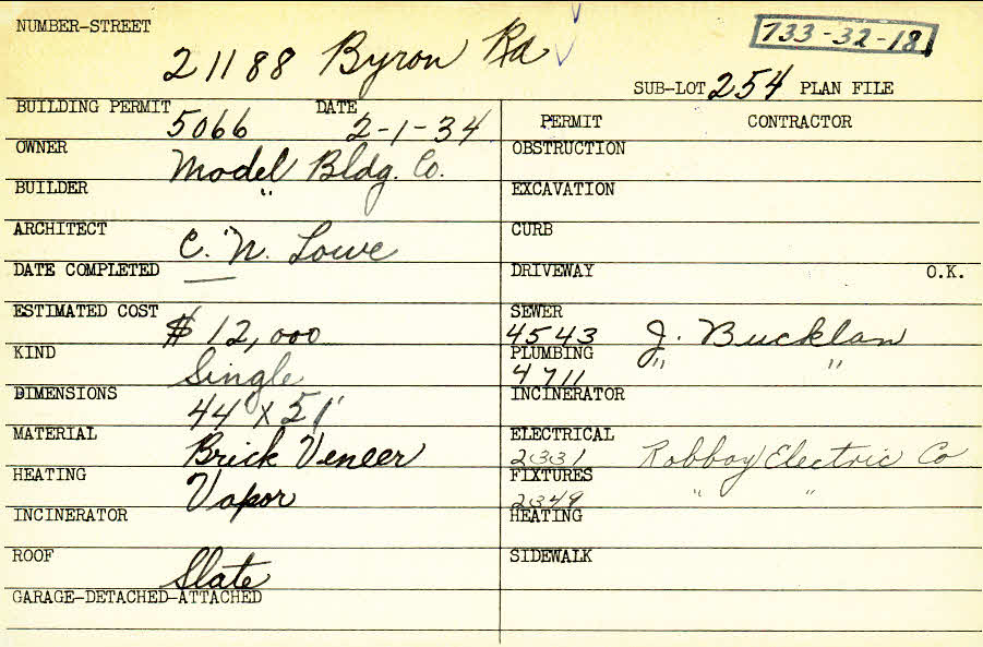 21188 Byron Road Shaker Heights, OH 44122 PARCEL ID: 733-32-018 Building Permit Date: 02-01-1934 Plan File Number: 4903 Microfilm Roll: Roll#68 Neighborhood: Mercer Owner: Model Building Company Builder: Model Building Company Architect: Lowe, C. N. Estimated Cost: 12000 Kind: Single, Single Residence or Dwelling Material: Brick Veneer Heating: Vapor Roof: Slate |