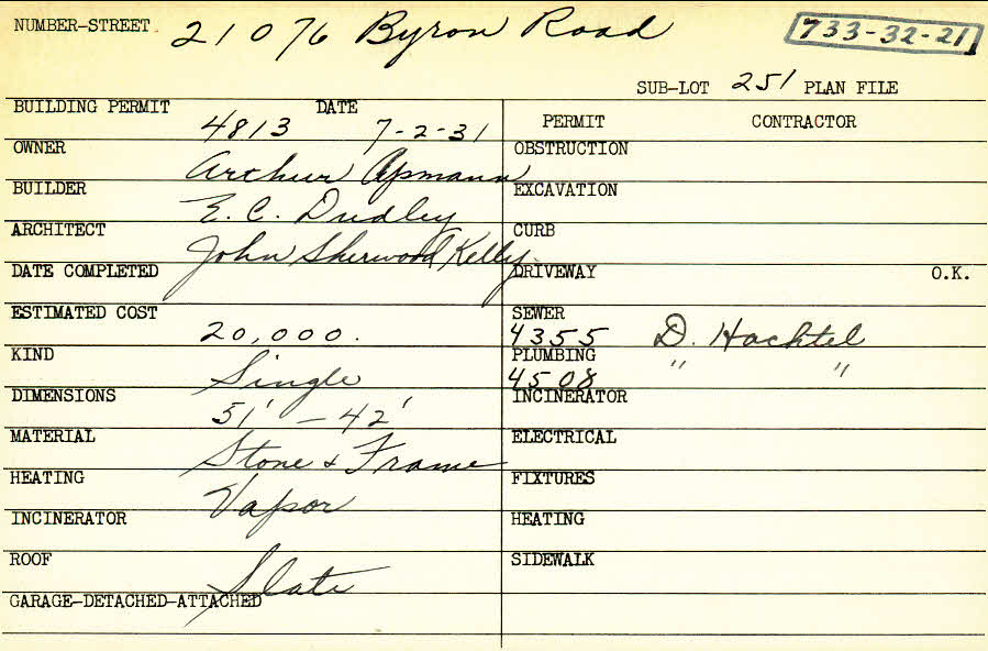 21076 Byron Road Shaker Heights, OH 44122 PARCEL ID: 733-32-021 Building Permit Date: 07-02-1931 Plan File Number: 2855 scanned Microfilm Roll: Roll041 Neighborhood: Mercer Owner: Apmann, Arthur Builder: Dudley, E. C. Architect: Kelly, John Sherwood Estimated Cost: 20000 Kind: Single, Single Residence or Dwelling Material: Stone and Frame Heating: Vapor Roof: Slate |