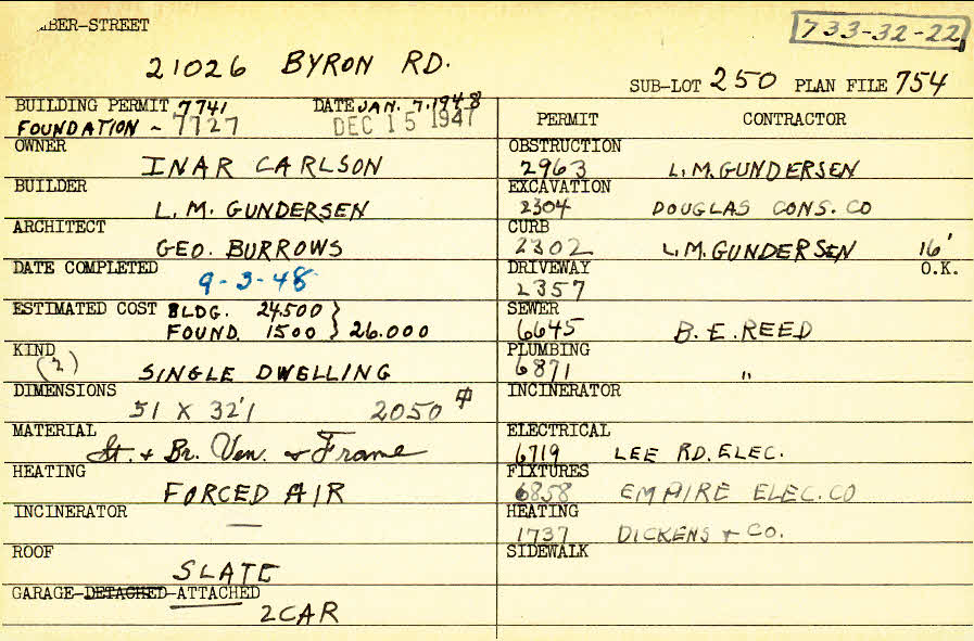 21026 Byron Road Shaker Heights, OH 44122 PARCEL ID: 733-32-022 Building Permit Date: 12-15-1947 Plan File Number: 754 scanned, 6563 Microfilm Roll: Roll010, Roll#86 Neighborhood: Mercer Owner: Carlson, Inar Builder: Gundersen, L. M. Architect: Burrows, George Estimated Cost: 26000 Date Completed: 09-03-1948 Kind: Single, Single Residence or Dwelling (2) Material: Stone and Brick Veneer and Frame Heating: Forced Air Roof: Slate Garage: attached 2 car |