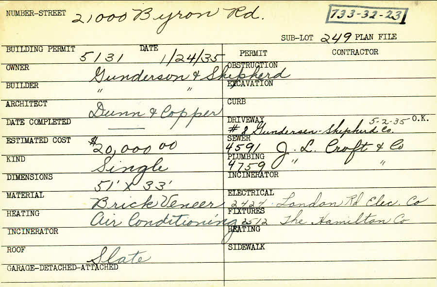 21000 Byron Road Shaker Heights, OH 44122 PARCEL ID: 733-32-023 Building Permit Date: 01-24-1935 Plan File Number: 6382, 7296 Microfilm Roll: Roll#85, Roll#92 Neighborhood: Mercer Owner: Gunderson and Shepherd Builder: Gunderson and Shepherd Architect: Dunn and Copper Estimated Cost: 20000 Kind: Single, Single Residence or Dwelling Material: Brick Veneer Heating: Air Conditioned Roof: Slate |
