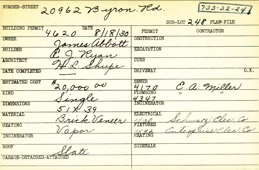 20962 Byron Road Shaker Heights, OH 44122 PARCEL ID: 733-32-024 Building Permit Date: 08-18-1930 Plan File Number: 3773 Microfilm Roll: Roll#56 Neighborhood: Mercer Owner: Abbott, James Builder: Ryan, E. J. Architect: Shupe, H. L. Estimated Cost: 20000 Kind: Single, Single Residence or Dwelling Material: Brick Veneer Heating: Vapor Roof: Slate |