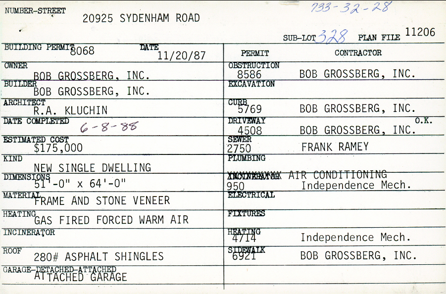 20925 Sydenham Road Shaker Heights, OH 44122 PARCEL ID: 733-32-028 Building Permit Date: 11-20-1987 Plan File Number: 11206* Microfilm Roll: NewRoll#7 Neighborhood: Mercer Owner: Bob Grossberg, Inc Builder: Bob Grossberg, Inc Architect: Kluchin, R. A. Estimated Cost: 175000 Date Completed: 06-08-1988 Kind: Single, Single Residence or Dwelling Material: Frame and Stone Veneer Heating: Forced Air - Gas Roof: Asphalt Shingles Garage: attached |