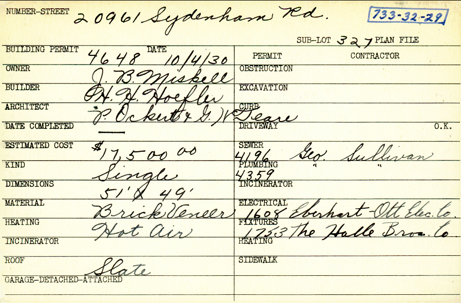 20961 Sydenham Road Shaker Heights, OH 44122 PARCEL ID: 733-32-029 Building Permit Date: 10-04-1930 Plan File Number: 0 Neighborhood: Mercer Owner: Miskell, J. B. Builder: Hoefler, H. H. Architect: Ockert, Paul and Teare, George W. Estimated Cost: 17500 Kind: Single, Single Residence or Dwelling Material: Brick Veneer Heating: Hot Air Roof: Slate |
