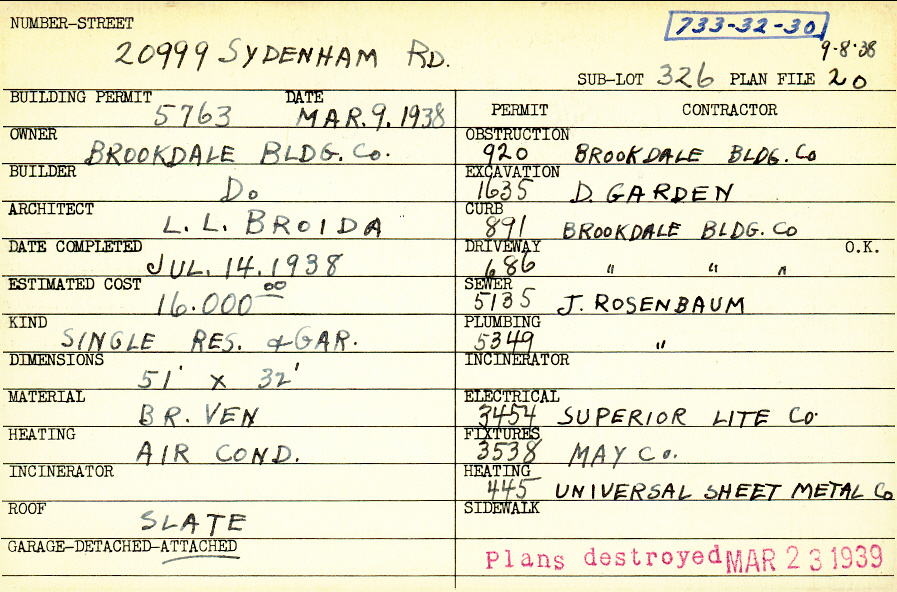 20999 Sydenham Road Shaker Heights, OH 44122 PARCEL ID: 733-32-030 Building Permit Date: 03-09-1938 Plan File Number: 20 Neighborhood: Mercer Owner: Brookdale Building Company Builder: Brookdale Building Company Architect: Broida, L. L. Estimated Cost: 16000 Date Completed: 07-14-1938 Kind: Single Dwelling and Garage Material: Brick Veneer Heating: Air Conditioned Roof: Slate Garage: attached |