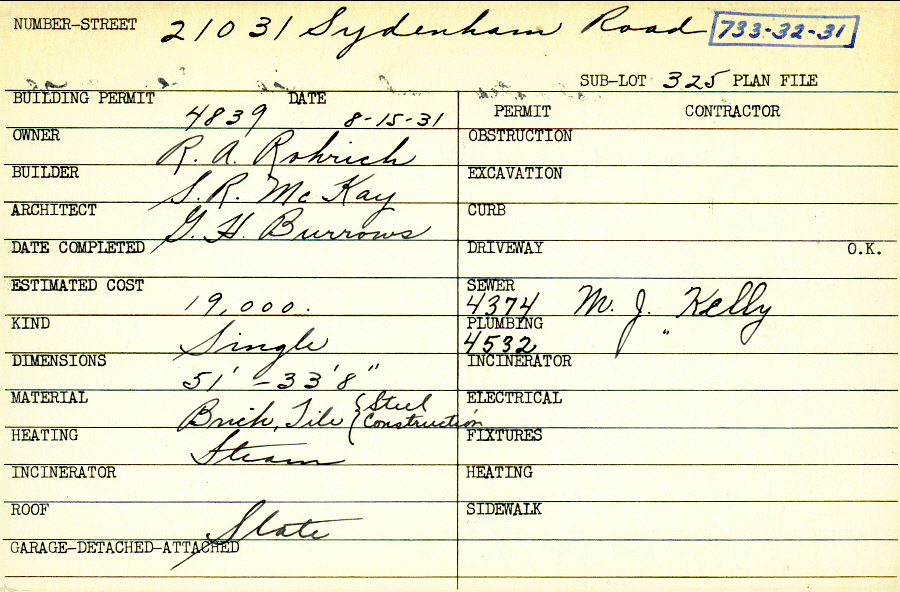 21031 Sydenham Road Shaker Heights, OH 44122 PARCEL ID: 733-32-031 Building Permit Date: 08-15-1931 Plan File Number: 7790 Microfilm Roll: Roll#94 Neighborhood: Mercer Owner: Rohrick, R. A. Builder: McKay, S. R. Architect: Burrows, G. H. Estimated Cost: 19000 Kind: Single, Single Residence or Dwelling Material: Brick, Tile (Steel Construction) Heating: Steam Roof: Slate |