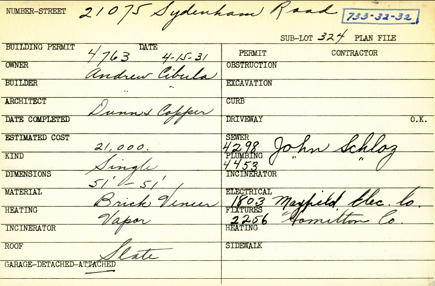 21075 Sydenham Road Shaker Heights, OH 44122 PARCEL ID: 733-32-032 Building Permit Date: 04-15-1931 Plan File Number: 12982 all scanned Microfilm Roll: NewRoll19 Neighborhood: Mercer Owner: Cibula, Andrew Builder: Cibula, Andrew Architect: Dunn and Copper Estimated Cost: 21000 Kind: Single, Single Residence or Dwelling Material: Brick Veneer Heating: Vapor Roof: Slate Garage: attached |
