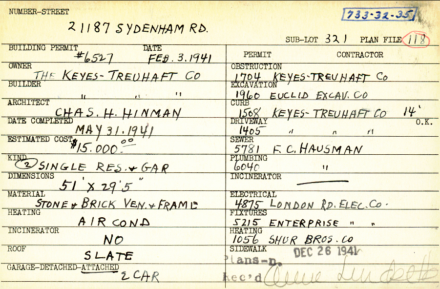 21187 Sydenham Road Shaker Heights, OH 44122 PARCEL ID: 733-32-035 Building Permit Date: 02-03-1941 Plan File Number: 118, 1957 Microfilm Roll: Roll#29 Neighborhood: Mercer Owner: The Keyes-Treuhaft Company Builder: The Keyes-Treuhaft Company Architect: Hinman, Charles H. Estimated Cost: 15000 Date Completed: 05-31-1941 Kind: Single Dwelling and Garage (2) Material: Stone and Brick Veneer and Frame Heating: Air Conditioned Roof: Slate Garage: attached 2 car |