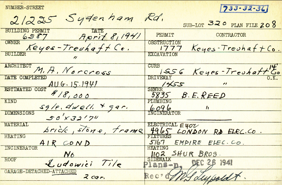 21225 Sydenham Road Shaker Heights, OH 44122 PARCEL ID: 733-32-036 Building Permit Date: 04-08-1941 Plan File Number: 208 Neighborhood: Mercer Owner: Keyes-Treuhaft Company Builder: Keyes-Treuhaft Company Architect: Norcross, M. A. Estimated Cost: 18000 Date Completed: 08-15-1941 Kind: Single Dwelling and Garage Material: Brick, Stone and Frame Heating: Air Conditioned Roof: Tile Garage: attached 2 car |
