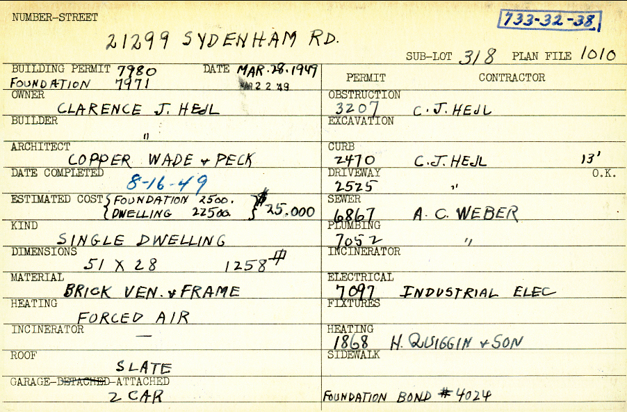 21299 Sydenham Road Shaker Heights, OH 44122 PARCEL ID: 733-32-038 Building Permit Date: 03-22-1949 Plan File Number: 1010 scanned, 5312 Microfilm Roll: Roll012, Roll#73 Neighborhood: Mercer Owner: Hejl, Clarence J. Builder: Hejl, Clarence J. Architect: Copper, Wade and Peck Estimated Cost: 25000 Date Completed: 08-16-1949 Kind: Single, Single Residence or Dwelling Material: Brick Veneer and Frame Heating: Forced Air Roof: Slate Garage: attached 2 car |
