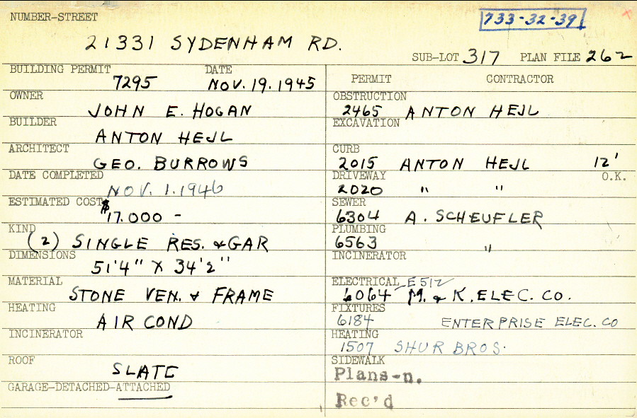 21331 Sydenham Road Shaker Heights, OH 44122 PARCEL ID: 733-32-039 Building Permit Date: 11-19-1945 Plan File Number: 262 scanned, 7177, 7715 Microfilm Roll: Roll002, Roll#91, Roll#94 Neighborhood: Mercer Owner: Hogan, John E. Builder: Hejl, Anton Architect: Burrows, George Estimated Cost: 17000 Date Completed: 11-01-1946 Kind: Single Dwelling and Garage (2) Material: Stone Veneer and Frame Heating: Air Conditioned Roof: Slate Garage: attached |