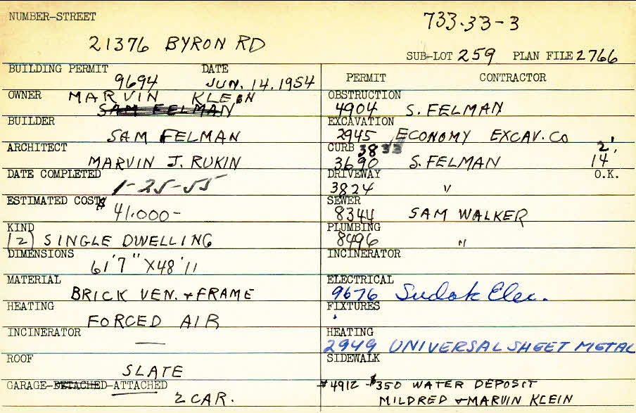 21376 Byron Road Shaker Heights, OH 44122 PARCEL ID: 733-33-003 Building Permit Date: 06-14-1954 Plan File Number: 2766 Microfilm Roll: Roll #38 Neighborhood: Mercer Owner: Klein, Marvin Builder: Felman, Sam Architect: Rukin, Marvin J. Estimated Cost: 41000 Date Completed: 01-25-1955 Kind: Single, Single Residence or Dwelling (2) Material: Brick Veneer and Frame Heating: Forced Air Roof: Slate Garage: attached 2 car |