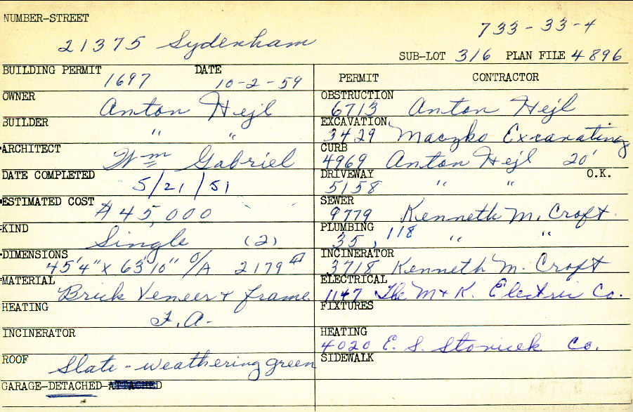 21375 Sydenham Road Shaker Heights, OH 44122 PARCEL ID: 733-33-004 Building Permit Date: 10-02-1959 Plan File Number: 4896, 13081 scanned Microfilm Roll: Roll#67. New Roll19 Neighborhood: Mercer Owner: Hejl, Anton Builder: Hejl, Anton Architect: Gabriel, William Estimated Cost: 45000 Date Completed: 05-21-1961 Kind: Single, Single Residence or Dwelling (2) Material: Brick Veneer and Frame Heating: Forced Air Roof: Slate Garage: detached |
