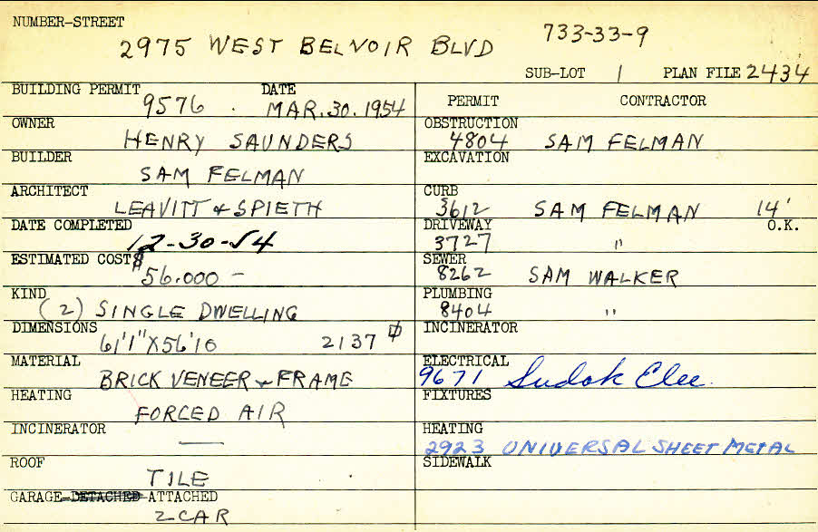 2975 West Belvoir Oval Shaker Heights, OH 44122 PARCEL ID: 733-33-009 Building Permit Date: 03-30-1954 Plan File Number: 2434 all scanned Microfilm Roll: Roll035 Neighborhood: Mercer Owner: Saunders, Henry Builder: Felman, Sam Architect: Leavitt and Spieth Estimated Cost: 56000 Date Completed: 12-30-1954 Kind: Single, Single Residence or Dwelling (2) Material: Brick Veneer and Frame Heating: Forced Air Roof: Tile Garage: attached 2 car Blueprints: online, see link above |