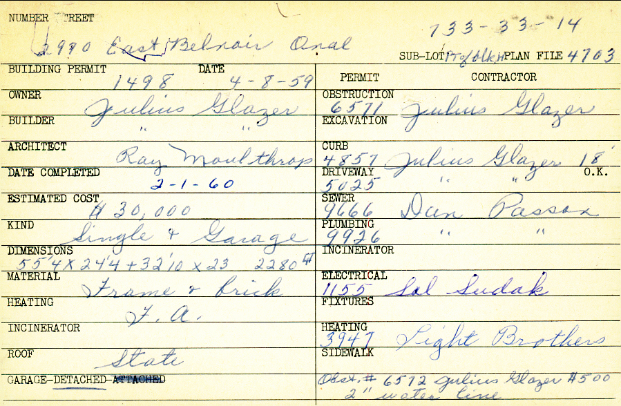2970 East Belvoir Oval Shaker Heights, OH 44122 PARCEL ID: 733-33-014 Building Permit Date: 04-08-1959 Plan File Number: 4703 Microfilm Roll: Roll#65 Neighborhood: Mercer Owner: Glazer, Julius Builder: Glazer, Julius Architect: Moulthrop, Ray Estimated Cost: 30000 Date Completed: 02-01-1960 Kind: Single Dwelling and Garage Material: Frame and Brick Heating: Forced Air Roof: Slate Garage: detached |