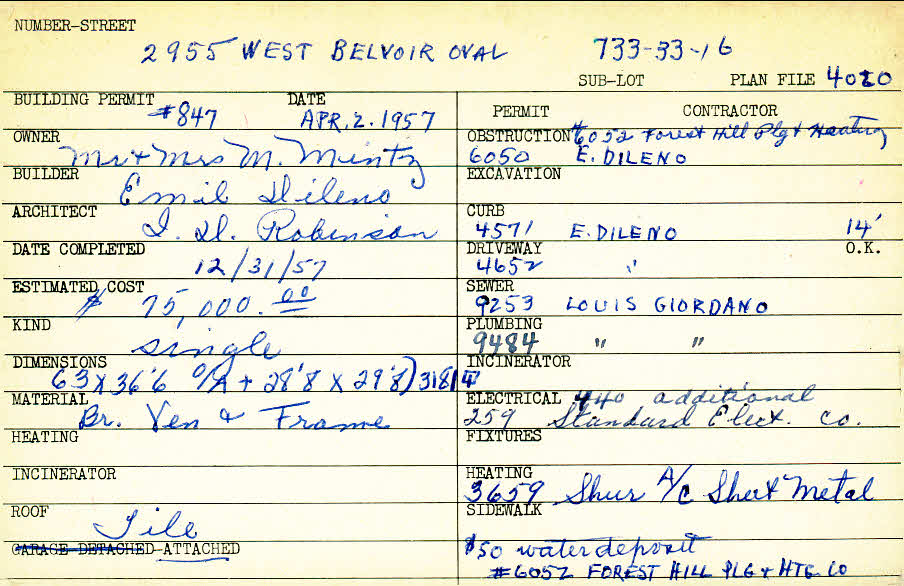 2955 West Belvoir Oval Shaker Heights, OH 44122 PARCEL ID: 733-33-016 Building Permit Date: 04-02-1957 Plan File Number: 4020 Microfilm Roll: Roll#58 Neighborhood: Mercer Owner: Mintz, Mr. and Mrs. M. Builder: Dileno, Emil Architect: Robinson, I. D. Estimated Cost: 75000 Date Completed: 12-31-1957 Kind: Single, Single Residence or Dwelling Material: Brick Veneer and Frame Roof: Tile Garage: attached |