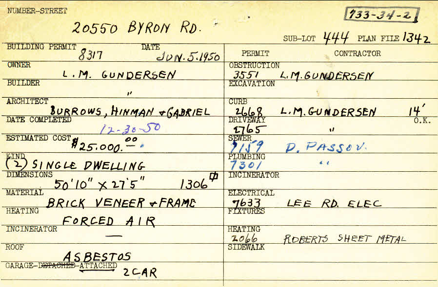 20550 Byron Road Shaker Heights, OH 44122 PARCEL ID: 733-34-002 Building Permit Date: 06-05-1950 Plan File Number: 1342 scanned, 3145, 6787 Microfilm Roll: Roll015, Roll#44, Roll#88 Neighborhood: Mercer Owner: Gundersen, L. M. Builder: Gundersen, L. M. Architect: Burrows, Hinman, Gabriel Estimated Cost: 25000 Date Completed: 12-30-1950 Kind: Single, Single Residence or Dwelling (2) Material: Brick Veneer and Frame Heating: Forced Air Roof: Asbestos Garage: attached 2 car |