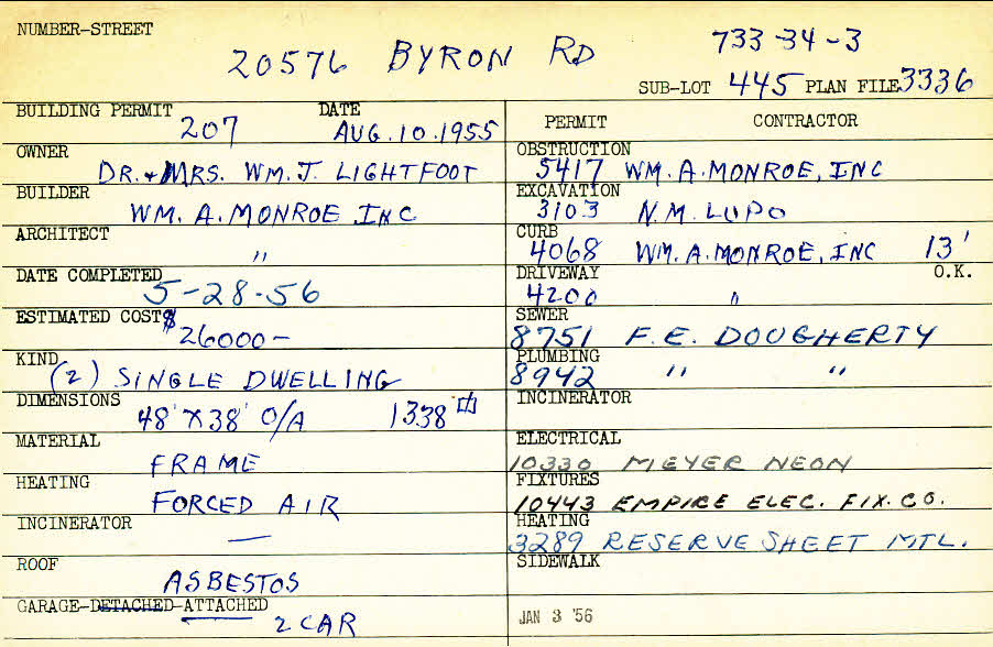 20576 Byron Road Shaker Heights, OH 44122 PARCEL ID: 733-34-003 Building Permit Date: 08-10-1955 Plan File Number: 3336 scanned Microfilm Roll: Roll#48 Neighborhood: Mercer Owner: Lightfoot, Dr. and Mrs. William J. Builder: William A. Monroe, Inc. Architect: William A. Monroe, Inc. Estimated Cost: 26000 Date Completed: 05-28-1956 Kind: Single, Single Residence or Dwelling (2) Material: Frame Heating: Forced Air Roof: Asbestos Garage: attached 2 car |