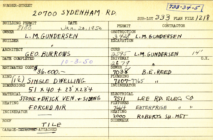20700 Sydenham Road Shaker Heights, OH 44122 PARCEL ID: 733-34-005 Building Permit Date: 01-20-1950 Plan File Number: 1218, 2561 all scanned Microfilm Roll: Roll014, Roll036 Neighborhood: Mercer Owner: Gundersen, L. M. Builder: Gundersen, L. M. Architect: Burrows, George Estimated Cost: 36000 Date Completed: 10-03-1950 Kind: Single, Single Residence or Dwelling Material: Stone and Brick Veneer and Siding Heating: Forced Air Roof: Tile Garage: attached Blueprints: online, see link above |