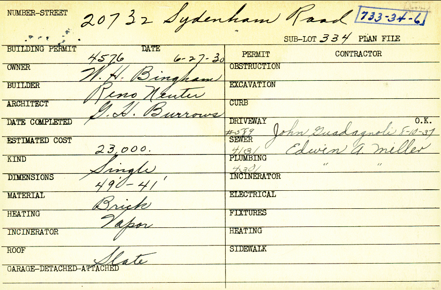 20732 Sydenham Road Shaker Heights, OH 44122 PARCEL ID: 733-34-006 Building Permit Date: 06-27-1930 Plan File Number: 11090 Microfilm Roll: NewRoll#6 Neighborhood: Mercer Owner: Bingham, W. H. Builder: Neuter, Reno Architect: Burrows, G. H. Estimated Cost: 23000 Kind: Single, Single Residence or Dwelling Material: Brick Heating: Vapor Roof: Slate |