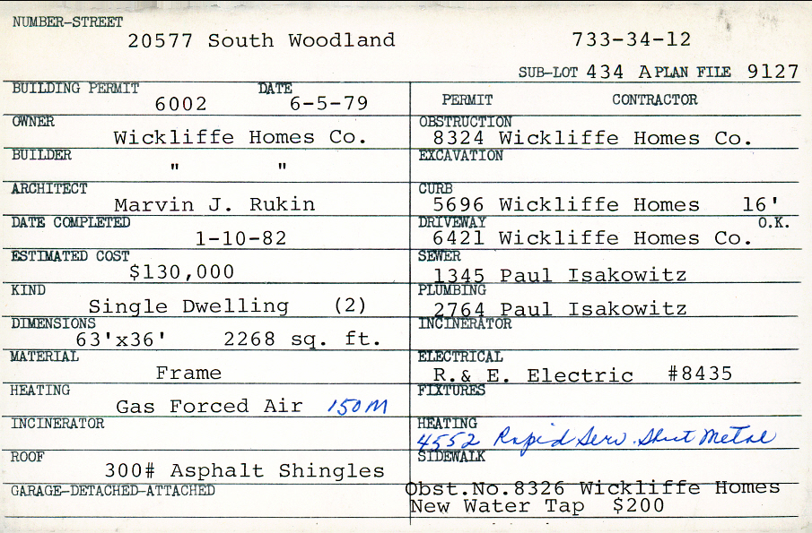 20577 South Woodland Road Shaker Heights, OH 44122 PARCEL ID: 733-34-012 Building Permit Date: 06-05-1979 Plan File Number: 9127, 12711 Microfilm Roll: Roll#102, NewRoll#14 Neighborhood: Mercer Owner: Wickliffe Homes Company Builder: Wickliffe Homes Company Architect: Rukin, Marvin J. Estimated Cost: 130000 Date Completed: 01-10-1982 Kind: Single, Single Residence or Dwelling (2) Material: Frame Heating: Forced Air - Gas Roof: 300# Min Asphalt |