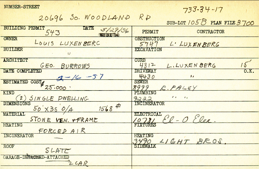 20696 South Woodland Road Shaker Heights, OH 44122 PARCEL ID: 733-34-017 Building Permit Date: 05-29-1956 Plan File Number: 3700 Microfilm Roll: Roll#51, Roll#55 Neighborhood: Mercer Owner: Luxenberg, Louis Builder: Luxenberg, Louis Architect: Burrows, George Estimated Cost: 25000 Date Completed: 02-16-1957 Kind: Single, Single Residence or Dwelling (2) Material: Stone Veneer and Frame Heating: Forced Air Roof: Slate Garage: attached 2 car |