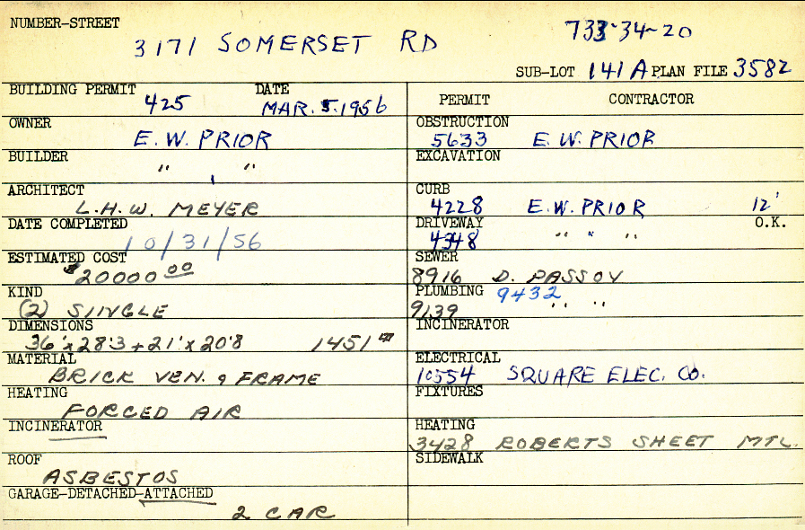3171 Somerset Drive Shaker Heights, OH 44122 PARCEL ID: 733-34-020 Building Permit Date: 03-05-1956 Plan File Number: 3582 Microfilm Roll: Roll#52 Neighborhood: Mercer Owner: Prior, E. W. Builder: Prior, E. W. Architect: Meyer, L. H. W. Estimated Cost: 20000 Date Completed: 10-31-1956 Kind: Single, Single Residence or Dwelling (2) Material: Brick Veneer and Frame Heating: Forced Air Roof: Asbestos Garage: attached 2 car |