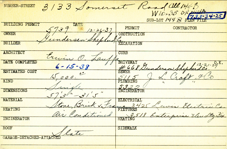 3133 Somerset Drive Shaker Heights, OH 44122 PARCEL ID: 733-34-025 Building Permit Date: 12-26-1937 Plan File Number: 0 Neighborhood: Mercer Owner: Gundersen-Shepherd Company Architect: Lauffe, Erwin O. Estimated Cost: 15000 Date Completed: 06-15-1938 Kind: Single, Single Residence or Dwelling Material: Stone, Brick and Frame Heating: Air Conditioned Roof: Slate Card Available: yes |