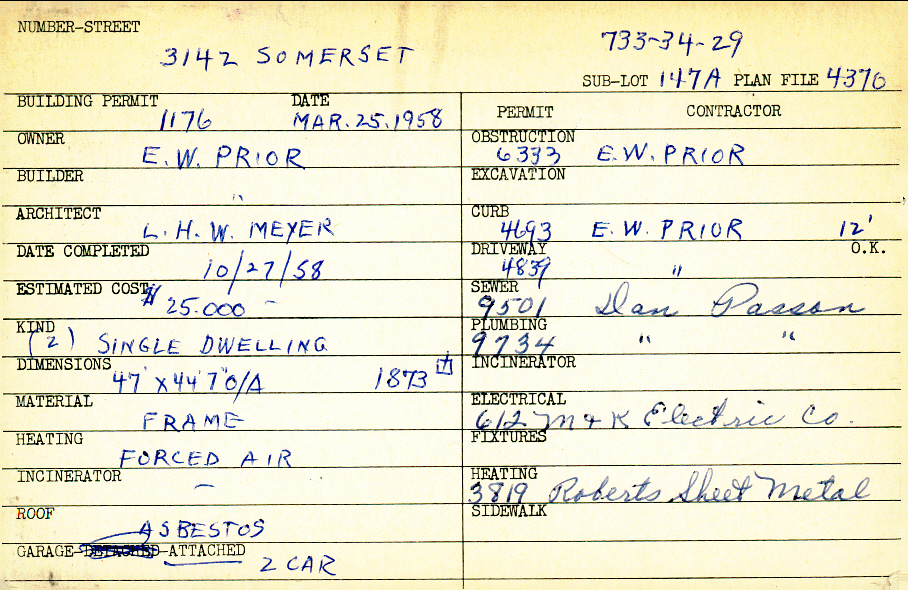 3142 Somerset Drive Shaker Heights, OH 44122 PARCEL ID: 733-34-029 Building Permit Date: 03-25-1958 Plan File Number: 4370 scanned, 11543 Microfilm Roll: Roll062, NewRoll#8 Neighborhood: Mercer Owner: Prior, E. W. Builder: Prior, E. W. Architect: Meyer, L. H. W. Estimated Cost: 25000 Date Completed: 10-27-1958 Kind: Single, Single Residence or Dwelling (2) Material: Frame Heating: Forced Air Roof: Asbestos Garage: attached 2 car |