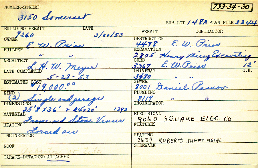 3150 Somerset Drive Shaker Heights, OH 44122 PARCEL ID: 733-34-030 Building Permit Date: 03-20-1953 Plan File Number: 2344, 4943 Microfilm Roll: Roll#34, Roll#68 Neighborhood: Mercer Owner: Prior, E. W. Builder: Prior, E. W. Architect: Meyer, L. H. W. Estimated Cost: 19000 Date Completed: 05-28-1953 Kind: Single Dwelling and Garage (2) Material: Frame and Stone Veneer Heating: Forced Air Roof: Asbestos Garage: attached |