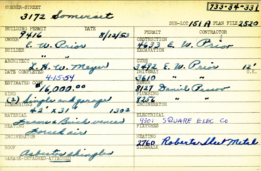 3172 Somerset Drive Shaker Heights, OH 44122 PARCEL ID: 733-34-033 Building Permit Date: 08-12-1953 Plan File Number: 2089, 2520 Microfilm Roll: Roll#32, Roll #36 Neighborhood: Mercer Owner: Prior, E. W. Builder: Prior, E. W. Architect: Meyer, L. H. W. Estimated Cost: 16000 Date Completed: 04-15-1954 Kind: Single Dwelling and Garage (2) Material: Frame and Brick Veneer Heating: Forced Air Roof: Asbestos Shingles Garage: attached |