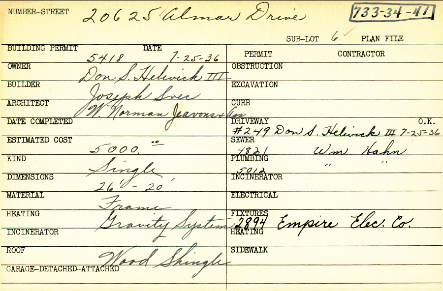 20625 Almar Drive Shaker Heights, OH 44122 PARCEL ID: 733-34-041 Building Permit Date: 07-25-1936 Plan File Number: 4456, 9341, 9342 Microfilm Roll: Roll#63, Roll#103 Neighborhood: Mercer Owner: Helevick, Don S. III Builder: Svec, Joseph Architect: W. Norman Jeavons and Associates Estimated Cost: 5000 Kind: Single, Single Residence or Dwelling Material: Frame Heating: Gravity System Roof: Wood Shingle |