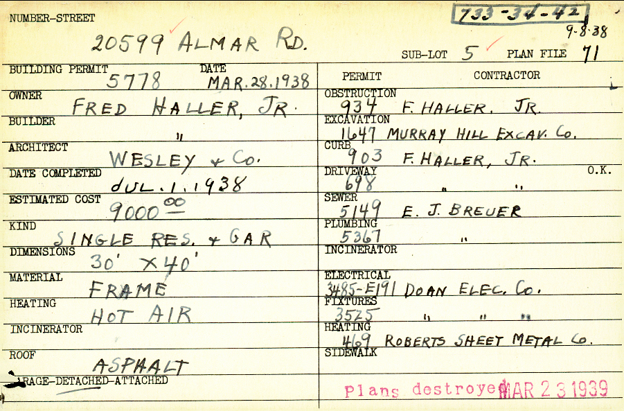 20599 Almar Drive Shaker Heights, OH 44122 PARCEL ID: 733-34-042 Building Permit Date: 03-28-1938 Plan File Number: 71 Neighborhood: Mercer Owner: Haller, Fred Jr. Builder: Haller, Fred Jr. Architect: Wesley and Company Estimated Cost: 9000 Date Completed: 07-01-1938 Kind: Single Dwelling and Garage Material: Frame Heating: Hot Air Roof: Asphalt Garage: detached |