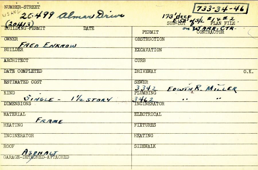 20499 Almar Drive Shaker Heights, OH 44122 PARCEL ID: 733-34-046 Building Permit Date: 10-21-1957 Plan File Number: 4285 all scanned Microfilm Roll: Roll062 Neighborhood: Mercer Owner: Enkrow, Fred Kind: Single, Single Residence or Dwelling Material: Frame Roof: Asphalt |