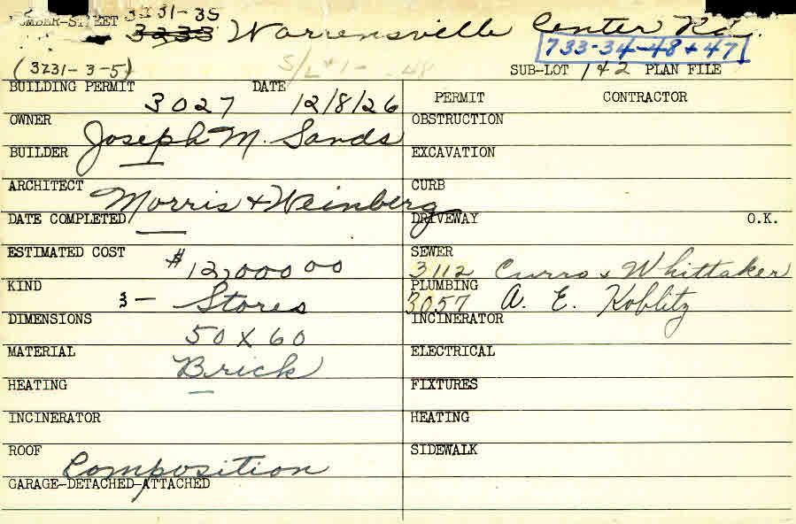 3231 Warrensville Center Road Shaker Heights, OH 44122 PARCEL ID: 733-34-048 Building Permit Date: 12-08-1926 Plan File Number: 5316, 6891, 10220, 10221, 11572 Microfilm Roll: Roll#73, Roll#89, NewRoll#3, NewRoll#8 Neighborhood: Malvern Owner: Sands, Joseph M. Architect: Morris and Weinberg Estimated Cost: 12000 Kind: Commercial - Retail or Office Material: Brick |