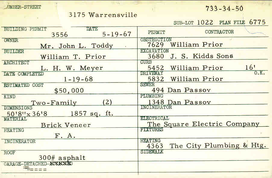 3175 Warrensville Center Road Shaker Heights, OH 44122 PARCEL ID: 733-34-050 Building Permit Date: 05-19-1967 Plan File Number: 6775, 10163 Microfilm Roll: Roll#88, NewRoll#2 Neighborhood: Malvern Owner: Toddy, Mr. John L. Builder: Prior, William T. Architect: Meyer, L. H. W. Estimated Cost: 50000 Date Completed: 01-19-1968 Kind: Duplex or Two-Family Material: Brick Veneer Heating: Forced Air Roof: 300# Min Asphalt Garage: detached |