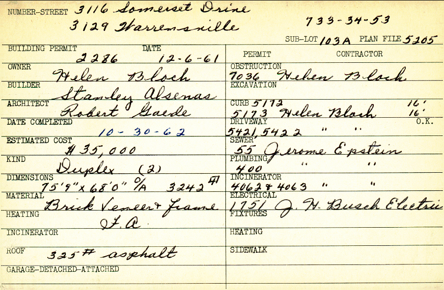 3116 Somerset Drive Shaker Heights, OH 44122 PARCEL ID: 733-34-053 Building Permit Date: 12-06-1961 Plan File Number: 5205 Microfilm Roll: Roll#72 Neighborhood: Mercer Owner: Bloch, Helen Builder: Alsenas, Stanley Architect: Gaede, Robert Estimated Cost: 35000 Date Completed: 10-30-1962 Kind: Duplex or Two-Family Material: Brick Veneer and Frame Heating: Forced Air Roof: 325# Asphalt |