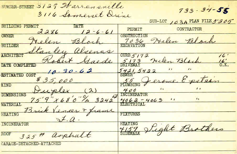 3129 Warrensville Center Road Shaker Heights, OH 44122 PARCEL ID: 733-34-055 Building Permit Date: 12-06-1961 Plan File Number: 5205 Neighborhood: Malvern Owner: Bloch, Helen Builder: Alsenas, Stanley Architect: Gaede, Robert Estimated Cost: 35000 Date Completed: 10-30-1962 Kind: Duplex or Two-Family Material: Brick Veneer and Frame Heating: Forced Air Roof: 325# Asphalt Card Available: yes |