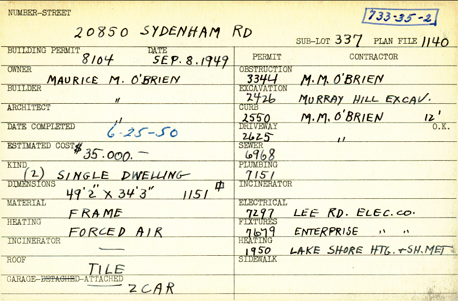 20850 Sydenham Road Shaker Heights, OH 44122 PARCEL ID: 733-35-002 Building Permit Date: 09-08-1949 Plan File Number: 1140 scanned, 3393 Microfilm Roll: Roll013, Roll#49 Neighborhood: Mercer Owner: O'Brien, Maurice M. Builder: O'Brien, Maurice M. Architect: O'Brien, Maurice M. Estimated Cost: 35000 Date Completed: 06-25-1950 Kind: Single, Single Residence or Dwelling (2) Material: Frame Heating: Forced Air Roof: Tile Garage: attached 2 car |